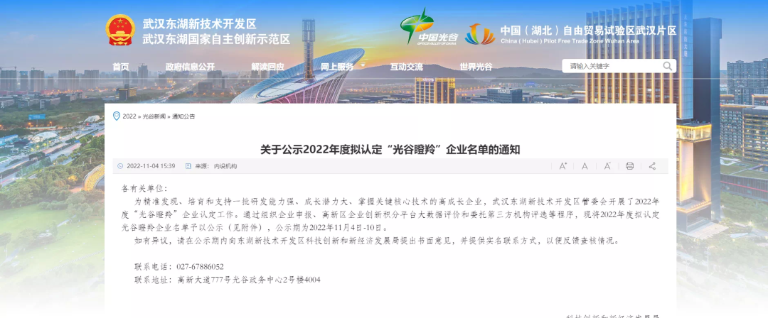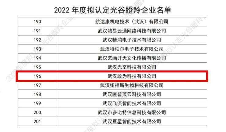11月4日東湖新技術開發區科技創新和新經濟發展局發布了《關于公示2022年度擬認定光谷瞪羚企業名單的通知》,武漢敢為科技有限公司成功獲評2022年度光谷瞪羚企業,這也是敢為科技連續四年獲得此榮譽。