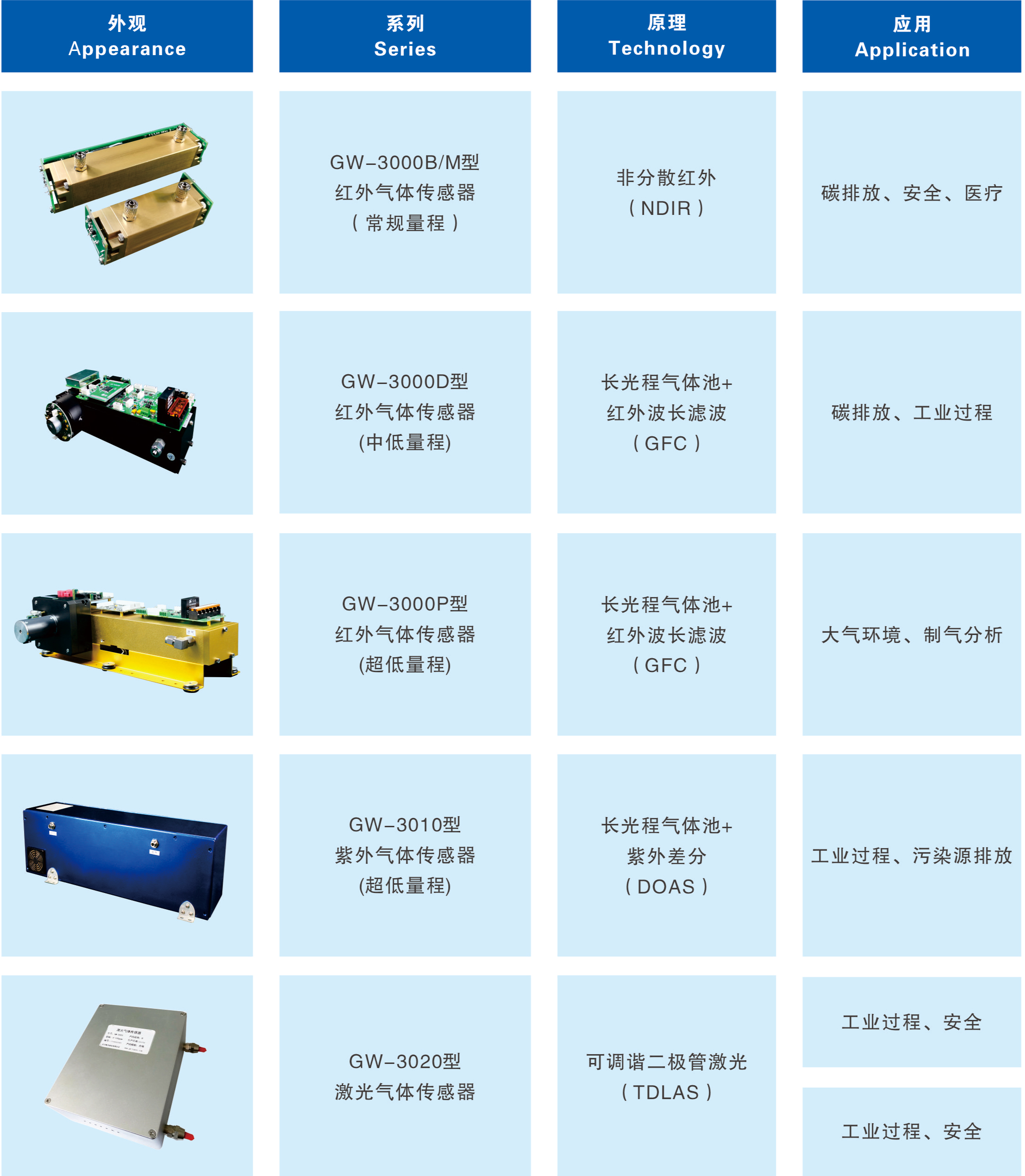 敢為科技擁有非分散紅外氣體檢測技術、紫外(紅外)差分吸收光譜技術、紅外氣體相關濾波檢測技術等多種光電檢測、光譜分析技術,在這些技術基礎上我們研制了可用于碳排放檢測、污染源監測、工業過程氣體分析、室內空氣質量檢測、空分用低濃度檢測等多個應用領域的氣體傳感器,可測量CO、CO2、CH4、N2O等多種氣體,型號全、種類多。