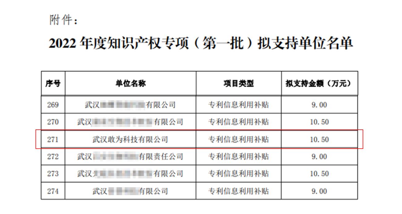 近日,武漢東湖高新區(qū)市場監(jiān)督管理局(知識產(chǎn)權局)發(fā)布了《2022 年度知識產(chǎn)權專項(第一批)擬支持單位名單,武漢敢為科技有限公司經(jīng)申報、初審、第三方審核、復核、征求相關部門意見等程序,獲得專利信息利用補貼10.5萬元。