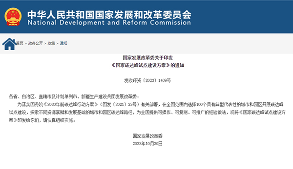 11月6日,國家發展改革委印發《國家碳達峰試點建設方案》的通知(發改環資〔2023〕1409號),在全國范圍內選擇100個具有典型代表性的城市和園區開展碳達峰試點建設,探索不同資源稟賦和發展基礎的城市和園區碳達峰路徑,為全國提供可操作、可復制、可推廣的經驗做法。
