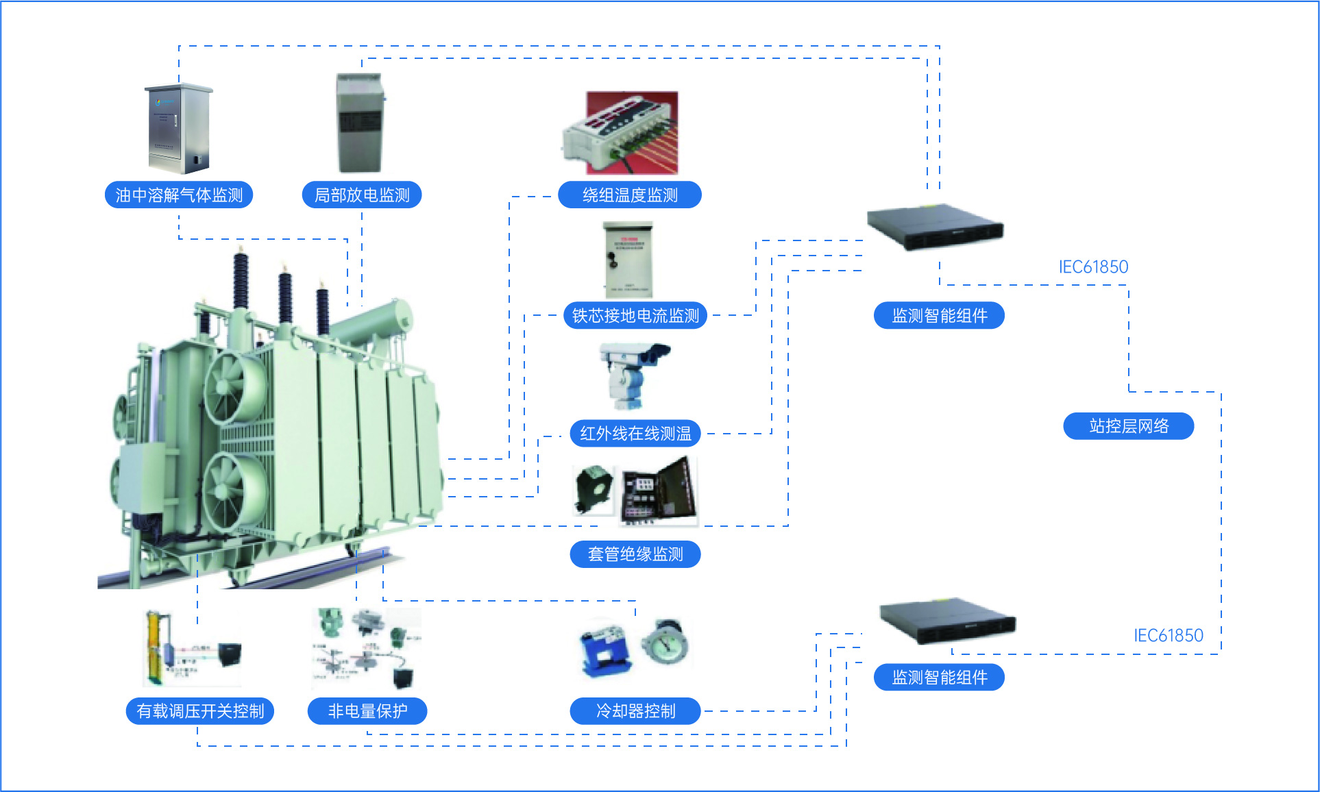 利用非接觸式紅外熱成像技術(shù)實時監(jiān)測變壓器表面溫度分布,識別局部過熱(如套管接頭、油 枕、散熱器異常等),預(yù)警絕緣老化、接觸不良等故障的在線監(jiān)測裝置。 |
