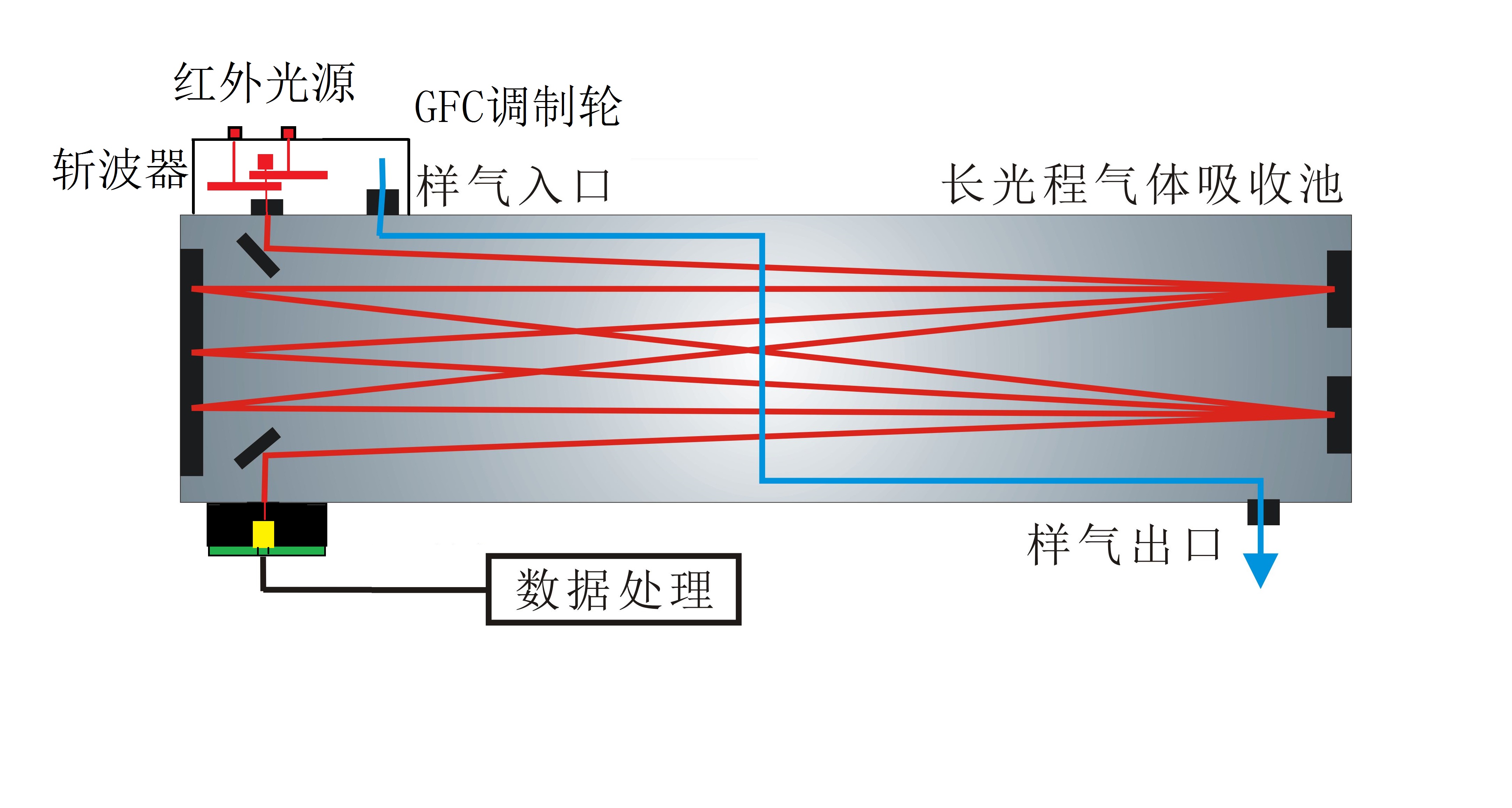 光源發出的紅外光經GFC調制輪交替進入氣體室,一路被充滿CO的氣室所吸收,一路穿過完全不含CO的氣室,兩路光分別經透鏡匯聚后由探測器接收,經過處理得到吸收信號和參考信號。