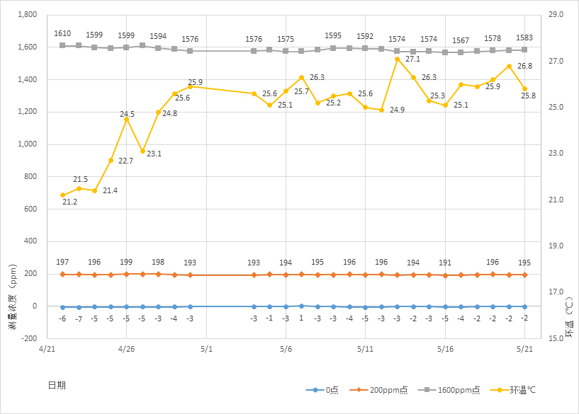 經過30天24h漂移的跟蹤測量,對傳感器長期測量的穩定性進行考察,得到了CO傳感器在零點、80%量程濃度的長期穩定性數據。傳感器氣室恒溫40℃在室溫環境下進行測量