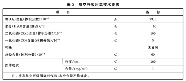 ● 航空呼吸用氧的技術要求應符合表2的規定。